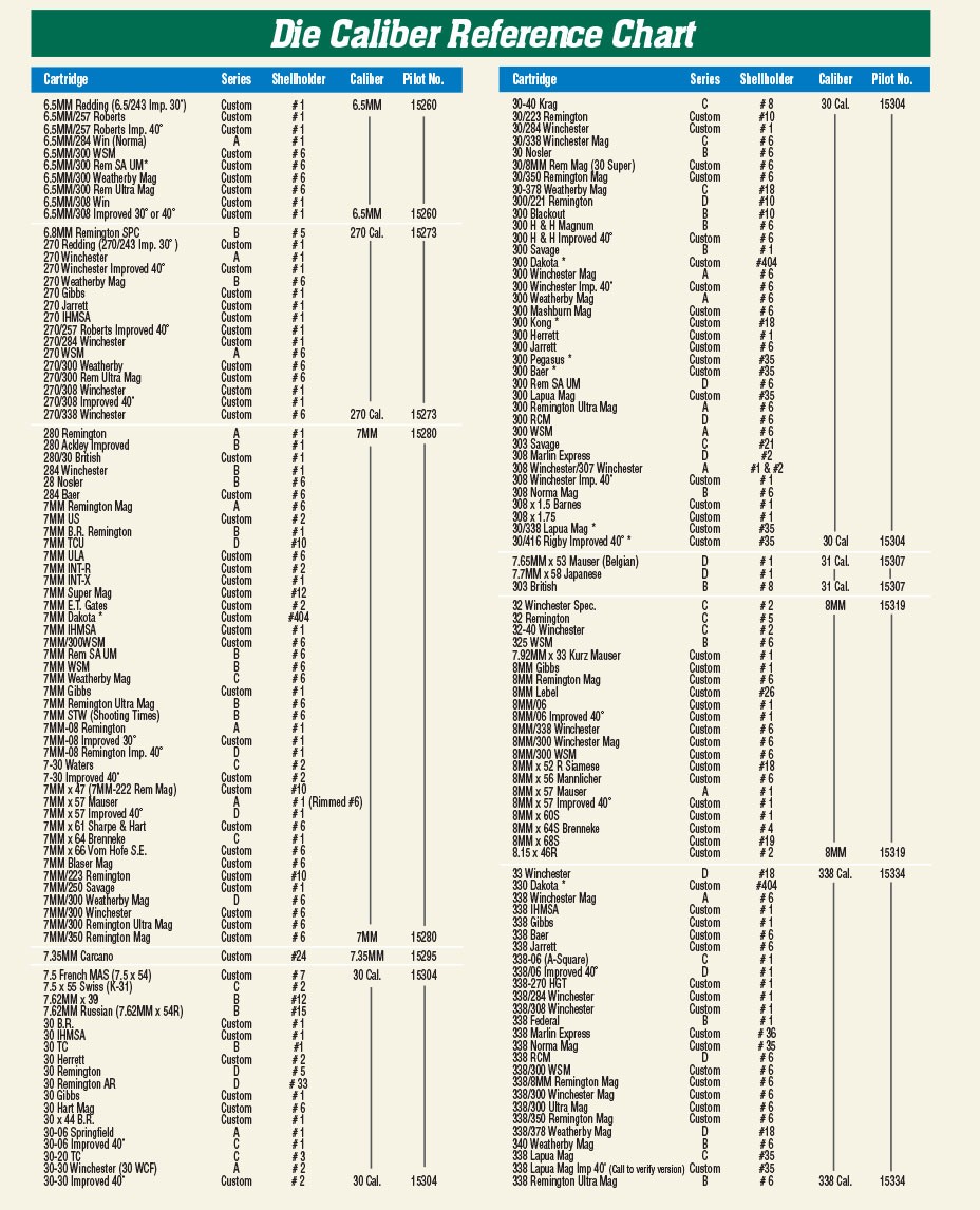 Please refer to the Redding Caliber Reference Chart below